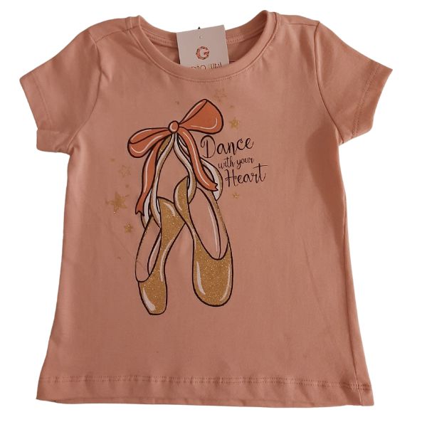 Ballet, um dos temas de estampa favoritos das meninas e das mamães também! Nesta camiseta uma ilustração de lindas sapatilhas com detalhes em glitter. Dance with your heart ( dance com seu coração).