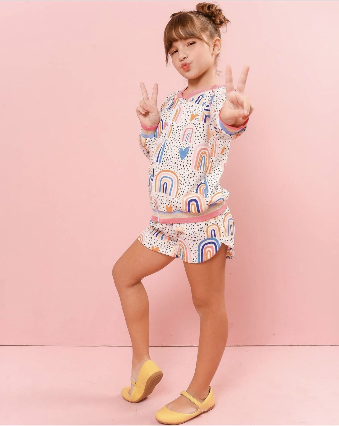 Conjunto Bomber Arco íris Conjunto Jaqueta + short Detalhes encantadores nos punhos, barra e gola. Zíper de encaixe Tecido Crepe