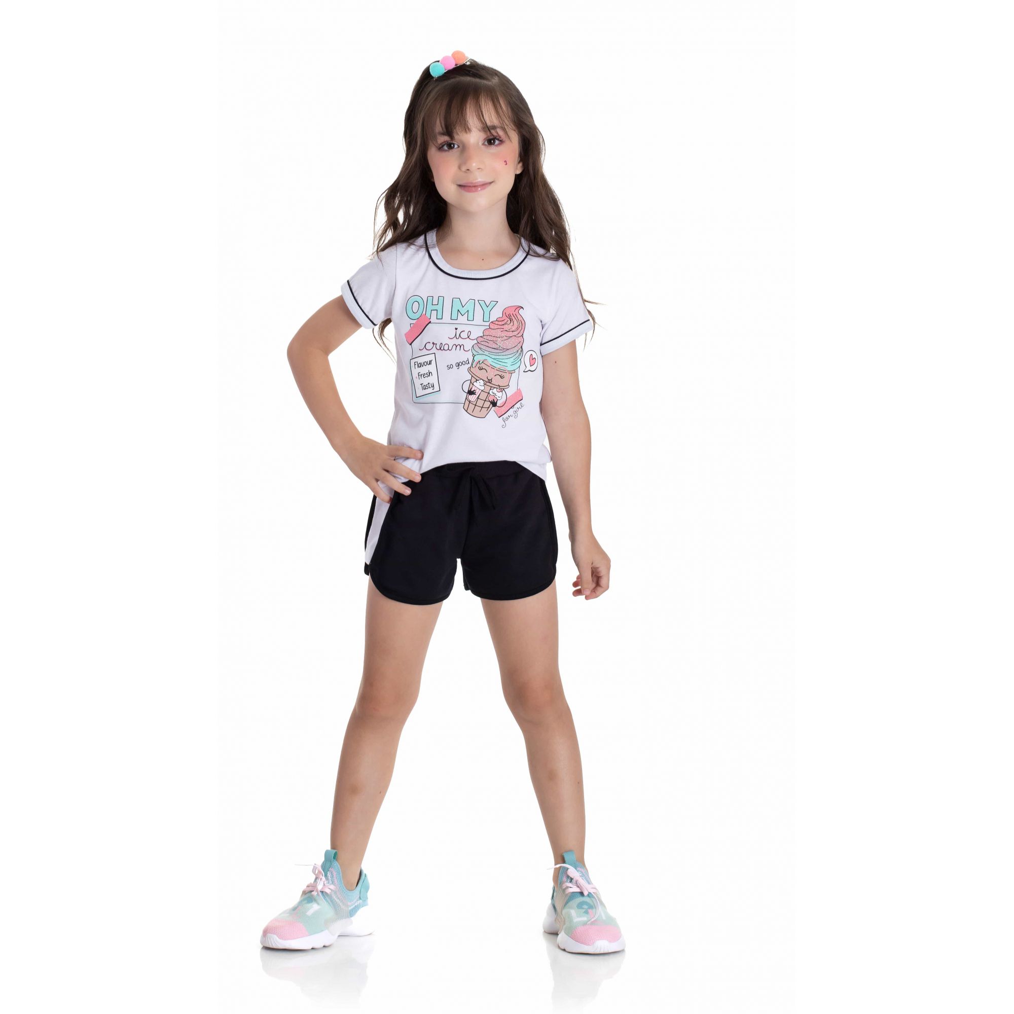 o conjunto blusa com estampa sorvete e shorts com aplicação de cadarço de friso decoratico é confeccionado em m/malha e moletinho (100% algodão) sendo um conjunto muito estiloso. o conjunto traz muito conforto sem perder a elegância.ótimo para dias mais frescos, passeio e momentos de lazer com a família e amigos.compre já