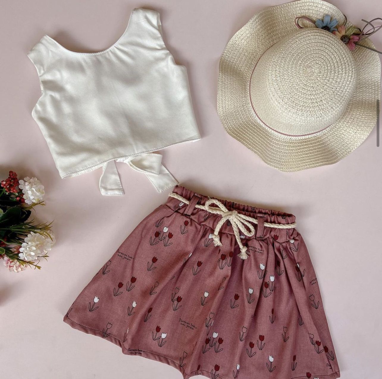 Conjunto com Saia Saia em tecido tricoline Cropped de amarração