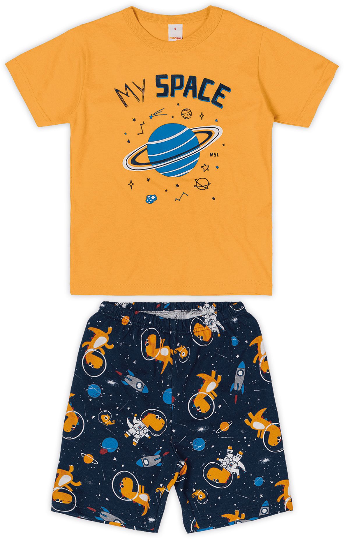 Conjunto Marisol Play composto por uma camiseta produzida em meia malha e modelagem tradicional + bermuda confeccionada em moletom leve sem felpa estampado, com elástico no cós.