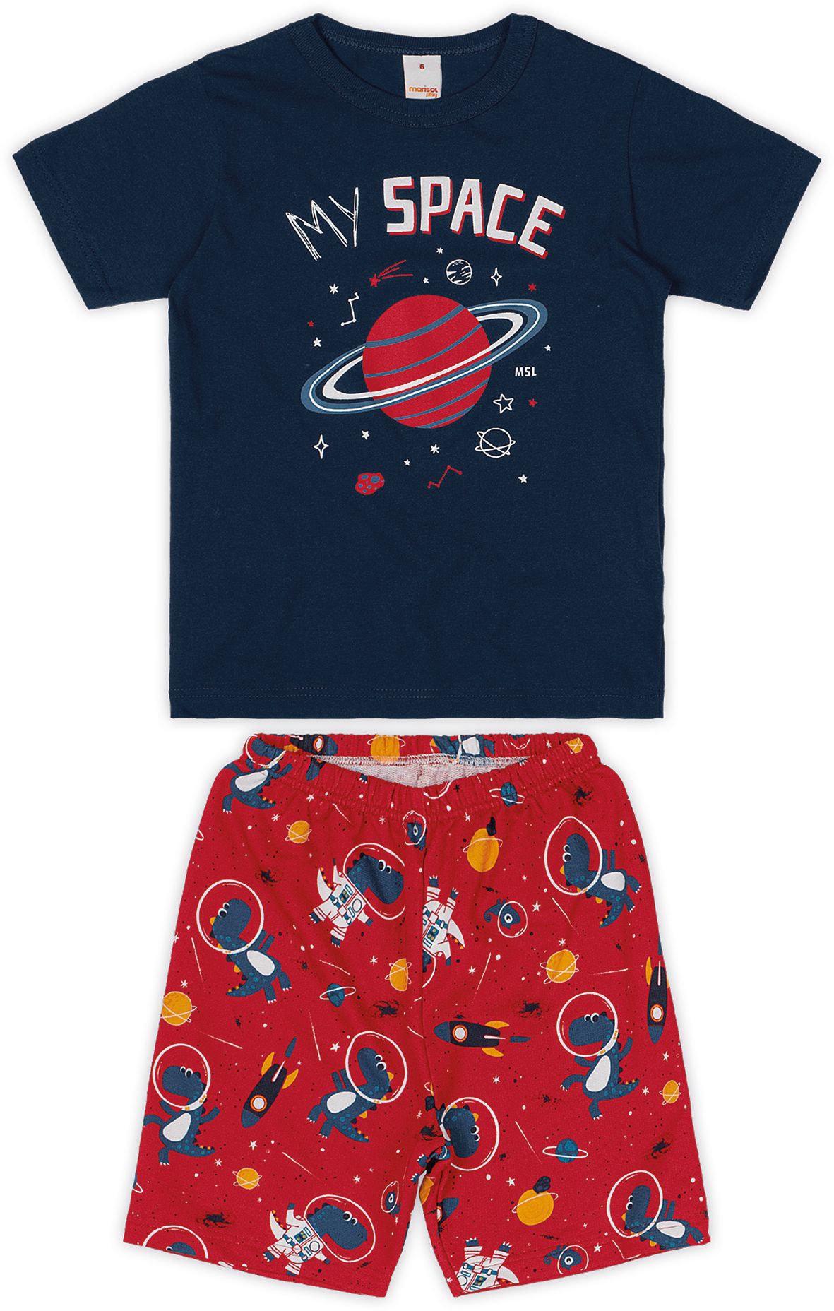 Conjunto Marisol Play composto por uma camiseta produzida em meia malha e modelagem tradicional + bermuda confeccionada em moletom leve sem felpa estampado, com elástico no cós.