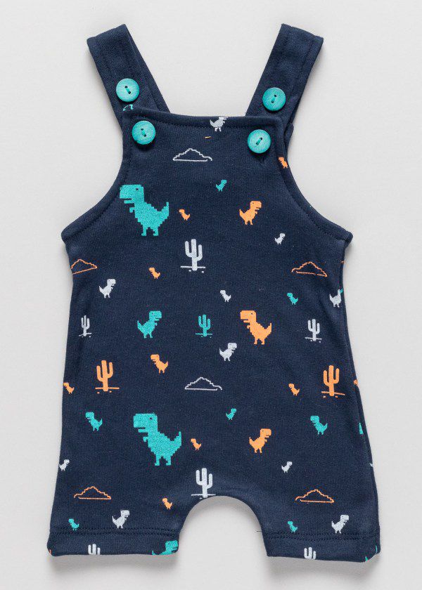 Jardineira Infantil Verão em suedine 100% algodão Marinho estampado Dino e botão para ajuste de altura.