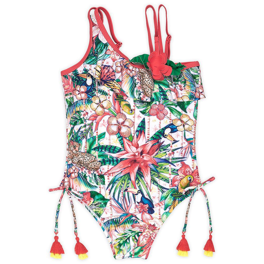 Alças ajustáveis, aplique de flor, detalhe de amarração e babados.