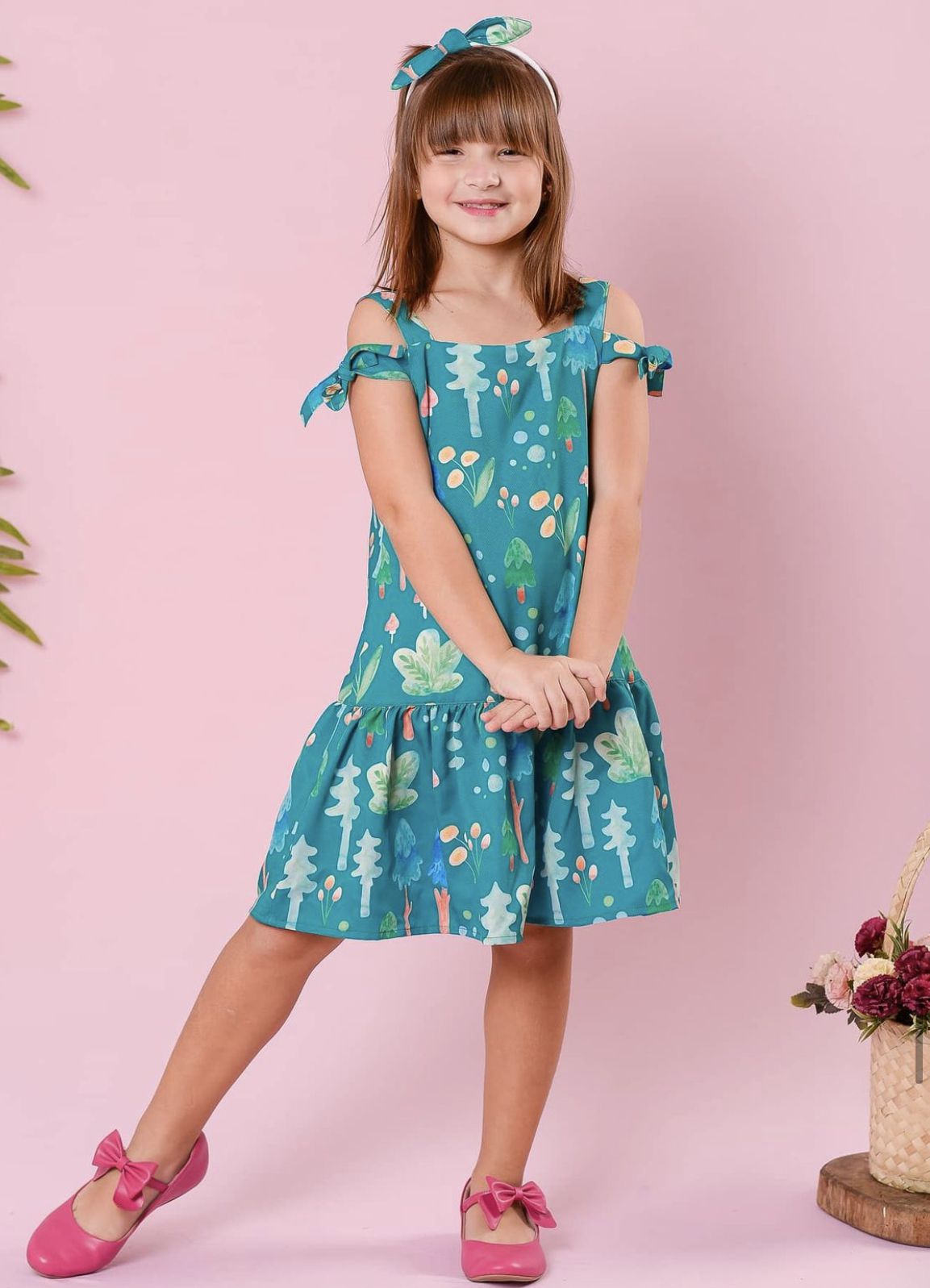 Vestido Verde Floresta Vestido Bem leve e confortável com estampa de floresta e fundo verde. Detalhes de amarração nas mangas e zíper nas costas. Tecido Crepe Twill